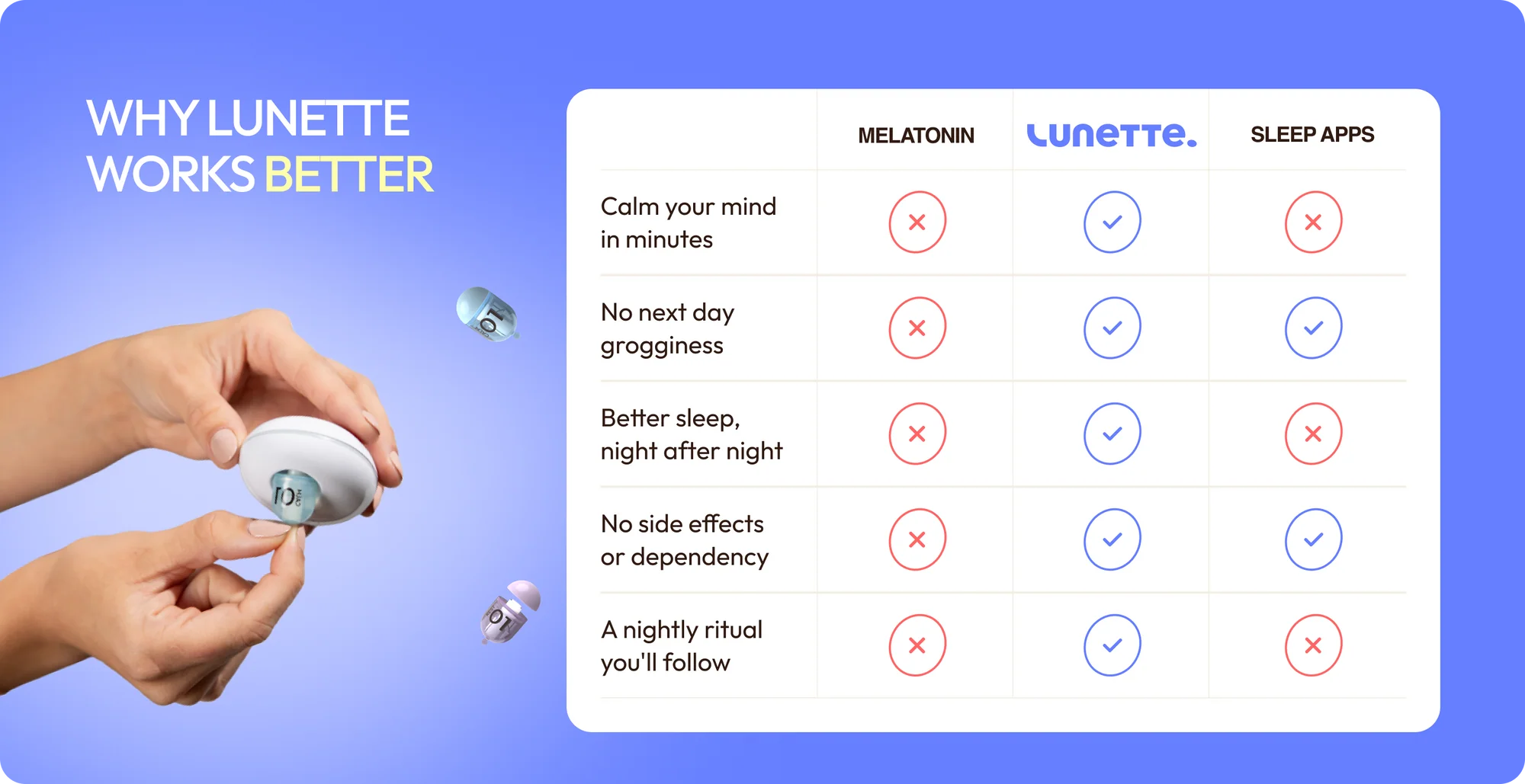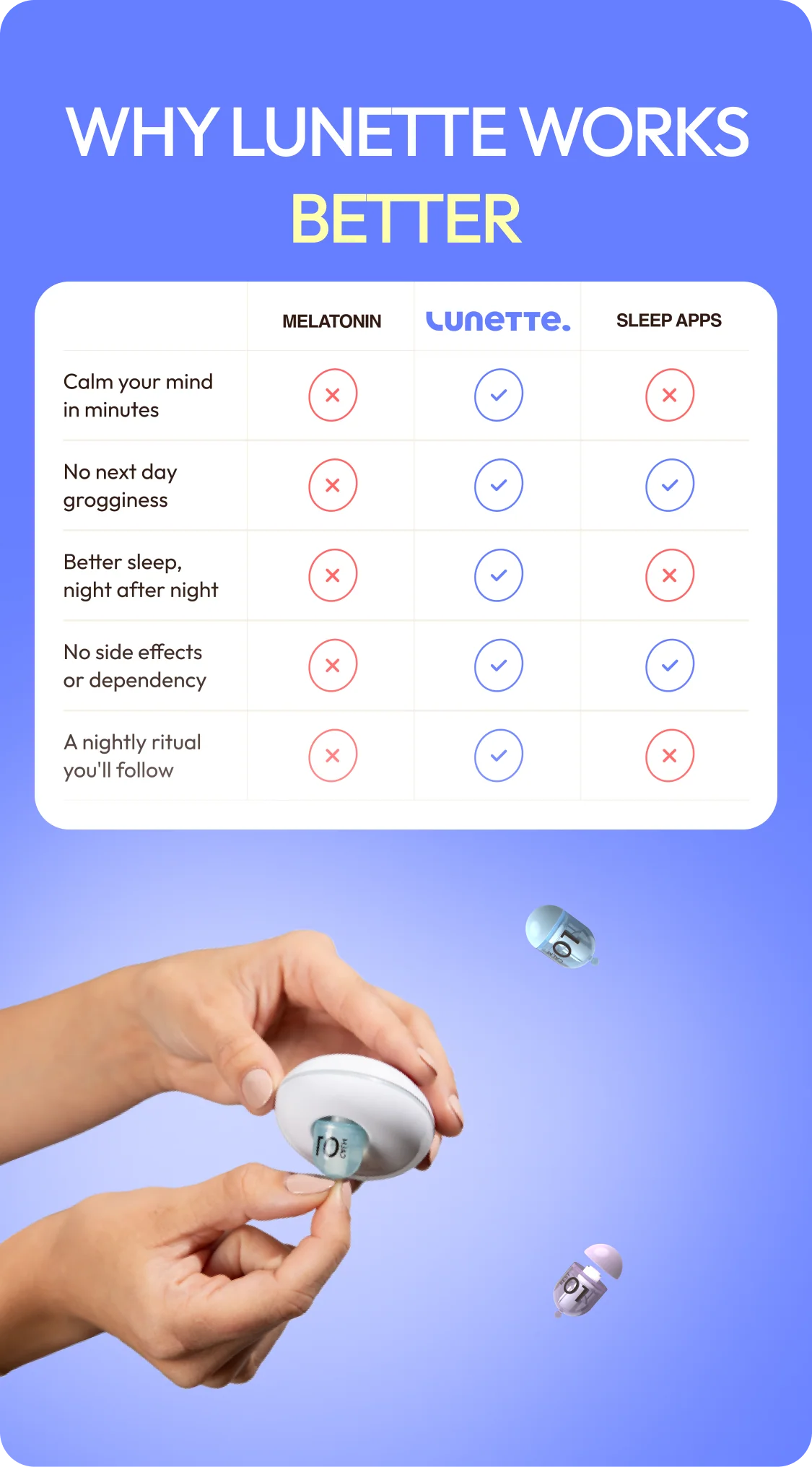 Lunette combines scent, vibration, and breathwork to help you fall asleep—no pills, no apps.